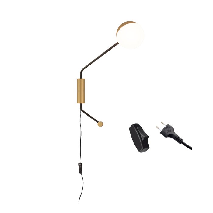 Arandela Lup25 preta com detalhe dourado moderna com haste móvel. O modelo é composto por 1 lâmpada G9, oculto pelo globo branco que compõe sua estrutura. Com o fio acompanhando, permite a instalação próximo a qualquer tomada e é ligado e desligado através de um interruptor que vem acoplado junto ao fio.