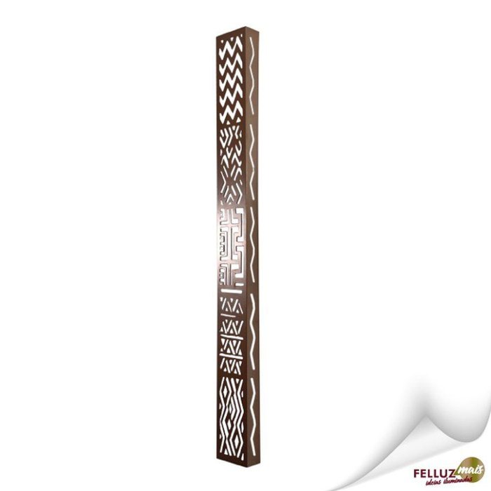 Arandela em alumínio de liga naval para uso externo e/ou interno, acabamento em pintura epóxi, com tratamento UV, resistente a maresia e intempéries. Proteção IP54.Peça com design exclusivo inspirada nos desenhos dos povos amazônicos para deixar seu ambiente ainda mais lindo!Indicada para lâmpada T5 LED (duas lâmpadas)Lâmpadas não inclusas.Nossas peças são desenvolvidas artesanalmente com materiais leves e duradouros
