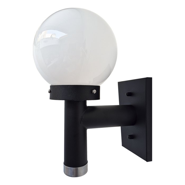 Linda arandela com design exclusivo e globo de vidro leitoso. Uso indicado para áreas externas (jardins, varandas e condominios).