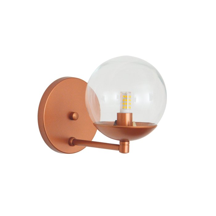 " ARANDELA JABUTICABA "- Produto em Alumínio- Pintura Cobre Fosco.- Vidro Cristal c/ diâmetro de 12cm.- Soquete G9 c/ fiação. ( Lâmpada halopin led NÃO inclusa)- Medidas: 12cm largura - 15cm altura - 18cm profundidade.