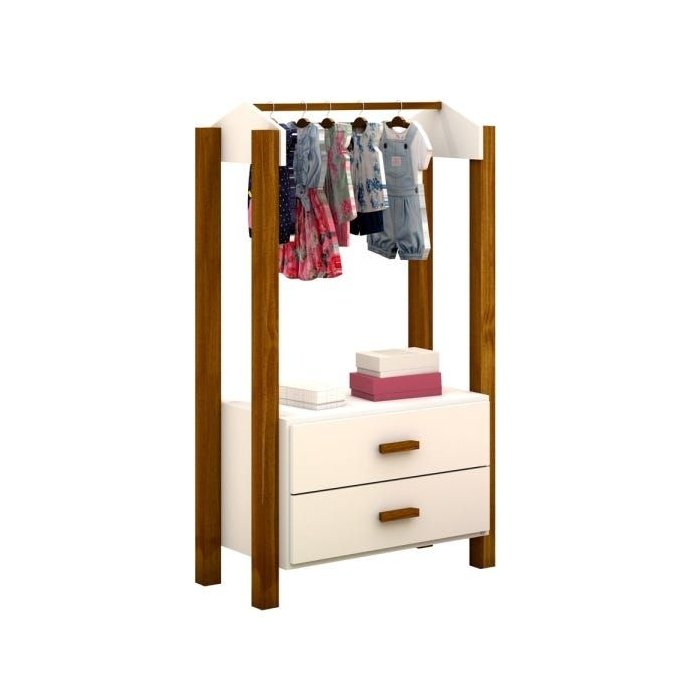Possui duas gavetas com corrediças metálicas e puxadores em madeira, assim também como seus pés e cabideiro são elaborados em madeira.