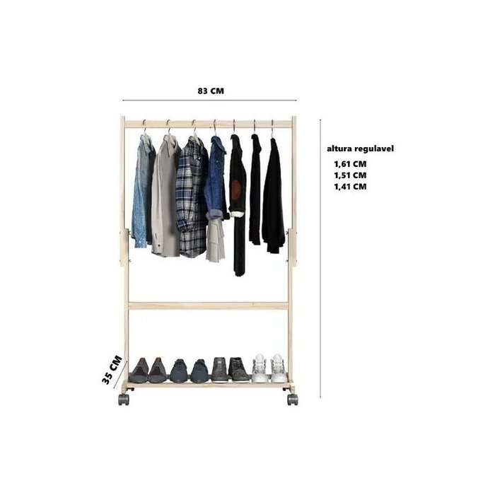 Com 161 cm de altura, possui Rodízios e prateleira. É ideal para colocar roupas, enfeites, sapatos, caixas organizadoras e etc..
