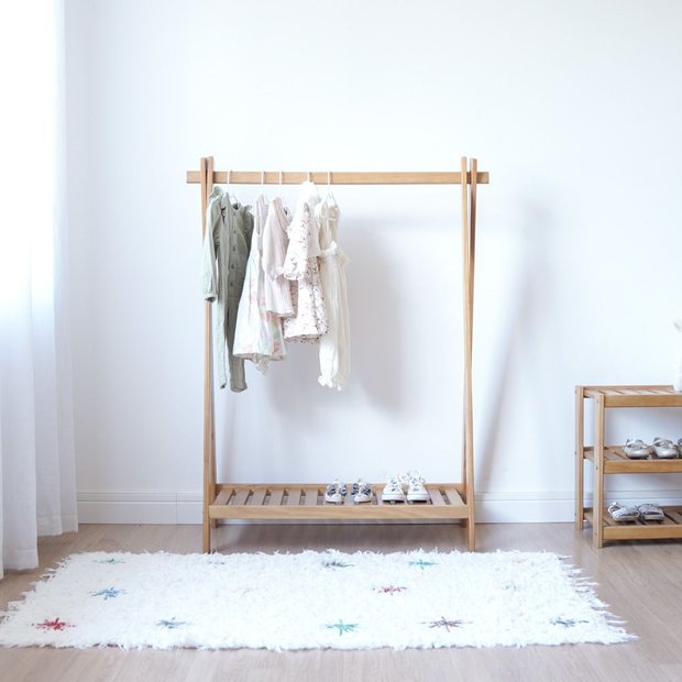 "A Arara para Roupas Slim pode ser usada no quarto dos pequeninos, fica super descolada e fofa! Ela possui uma prateleira ripada onde pode-se organizar os sapatos ou roupas e haste em madeira para cabideiro.''