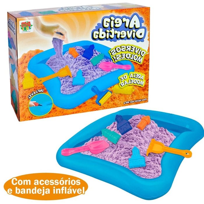 Brincar de massinha e modelar nunca foi tão divertido. A areia para modelar ajuda na criatividade, desenvolvimento da imaginação, coordenação motora e muitos outros benefícios para as crianças. Possui cores vibrantes ou clássica cor de areia. Produto não tóxico dermatologicamente testado com selo de segurança do Inmetro.