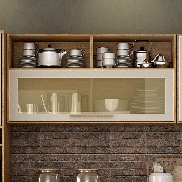 Esse modelo é composto por armários e prateleiras suspensos na parede, o que ajuda a aproveitar melhor a área disponível na cozinha.