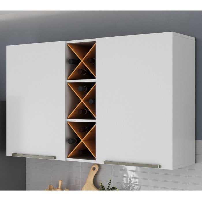 Esse modelo é composto por armários e prateleiras suspensos na parede, o que ajuda a aproveitar melhor a área disponível na cozinha.
