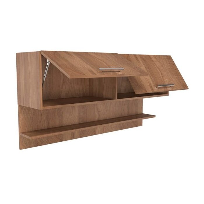 Esse modelo é composto por armários e prateleiras suspensos na parede, o que ajuda a aproveitar melhor a área disponível na cozinha.