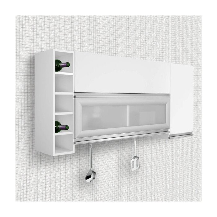 Esse modelo é composto por armários e prateleiras suspensos na parede, o que ajuda a aproveitar melhor a área disponível na cozinha.
