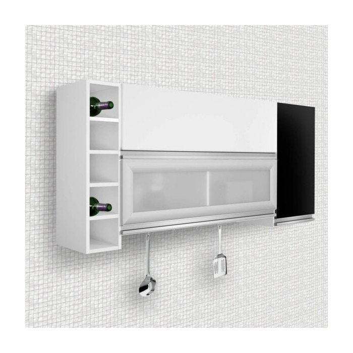 Esse modelo é composto por armários e prateleiras suspensos na parede, o que ajuda a aproveitar melhor a área disponível na cozinha.