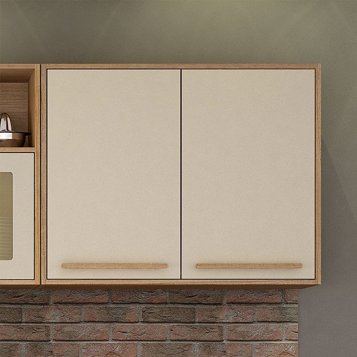 Esse modelo é composto por armários e prateleiras suspensos na parede, o que ajuda a aproveitar melhor a área disponível na cozinha.