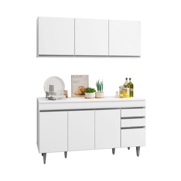 Quanto ao acabamento e estrutura também não há o que questionar, porque são fabricados em MDP 15mm com acabamento BP e os puxadores em alumínio modelo cava dão um toque de modernidade. Para completar, o tampo em MDP 15mm agrega ainda mais utilidade, uma vez que você pode fazer uso de itens decorativos ou até criar aquele cantinho do café, deixando o ambiente muito mais bonito, até porque o coração da casa merece esse cuidado.