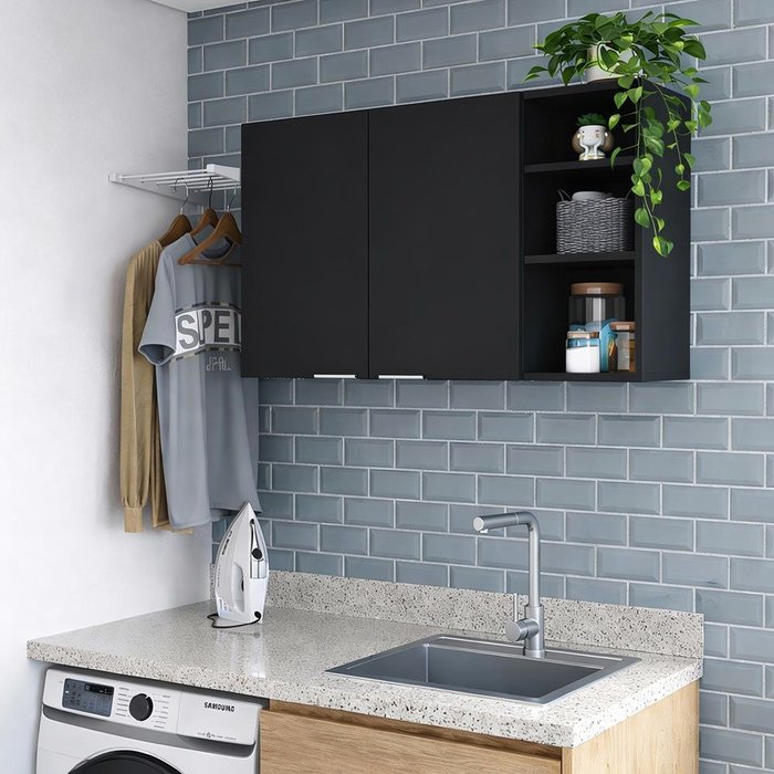 Armário Aéreo de Parede Embutido Multiuso Cozinha Lavanderia Nicho Organizador 2 Portas Ópera Preto