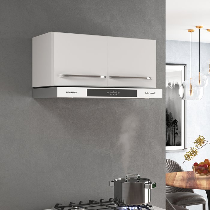 Esse modelo é composto por armários e prateleiras suspensos na parede, o que ajuda a aproveitar melhor a área disponível na cozinha.