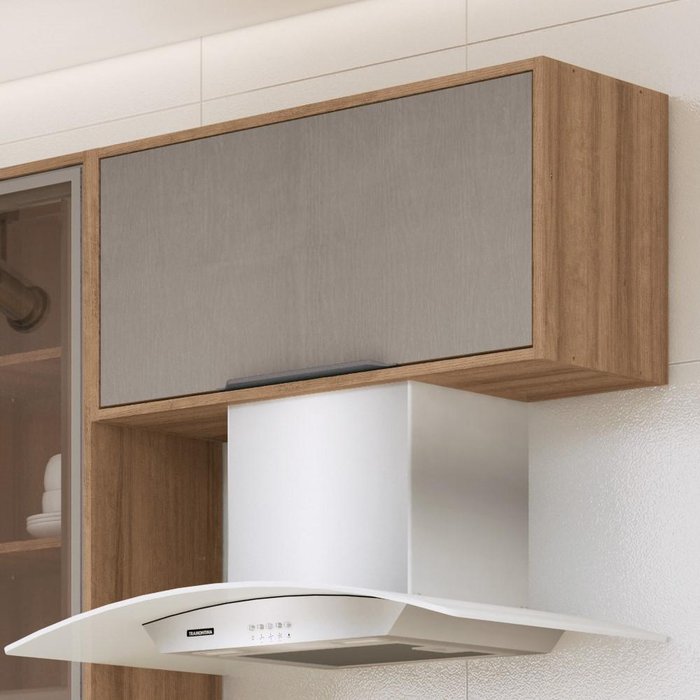 Esse modelo é composto por armários e prateleiras suspensos na parede, o que ajuda a aproveitar melhor a área disponível na cozinha.