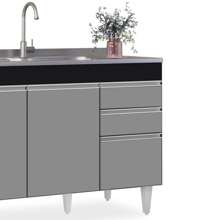 Por ser um cômodo onde praticidade e funcionalidade são conceitos que devem andar juntos, a cozinha muitas vezes é onde mais ficamos em dúvida sobre os complementos. Mas que tal investir em um kit com o essencial? Sim, a começar pelo Armário Virgínia que além das 3 portas com puxador em perfil metálico contém amplo espaço interno, já o balcão para pia Michigan Preto/Cinza é uma ótima alternativa por conter elementos indispensáveis nessa hora, que são as 3 portas com puxador em perfil metálico contendo amplo espaço interno e 2 gavetas para seus talheres! Tudo em MDP com acabamento em pintura BP e pés em PVC para sustentação do móvel!! Inclusive, possui pia inox que acompanha válvula com pino metálico e cuba com rebaixe novita!