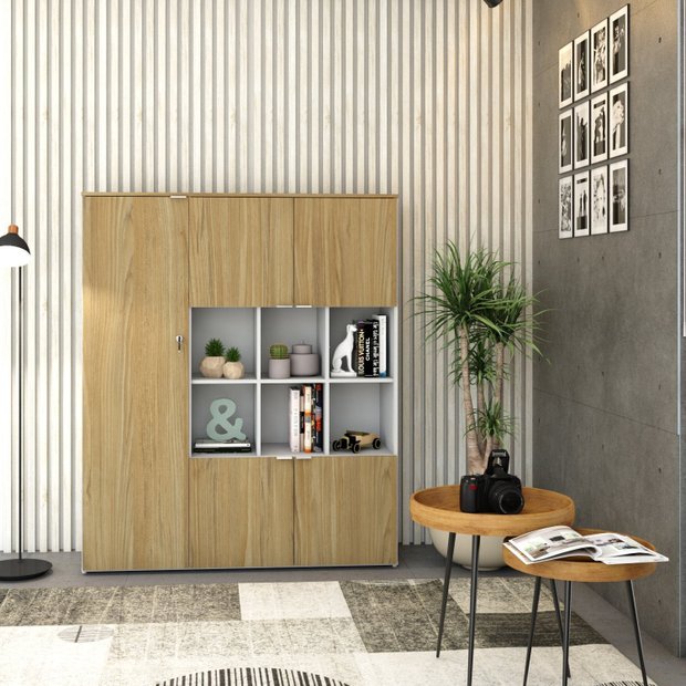 Armário Alto com Nichos WLAN135 WorkLab é uma peça de mobiliário que alia capacidade de armazenamento com um design elegante e moderno, ideal para escritórios que valorizam tanto a funcionalidade quanto a estética. Com nichos centrais abertos e cinco portas, este armário oferece uma solução de armazenamento diversificada, perfeita para exibir itens decorativos ou manter materiais de consulta rápida à mão. Suas portas possuem dobradiças com amortecedor que garantem um fechamento suave e silencioso, além dos puxadores em alumínio, elegantes e funcionais. O Armário WLAN135 WorkLab é mais que um simples móvel de armazenamento, é uma declaração de estilo que traz organização e sofisticação ao ambiente de trabalho.