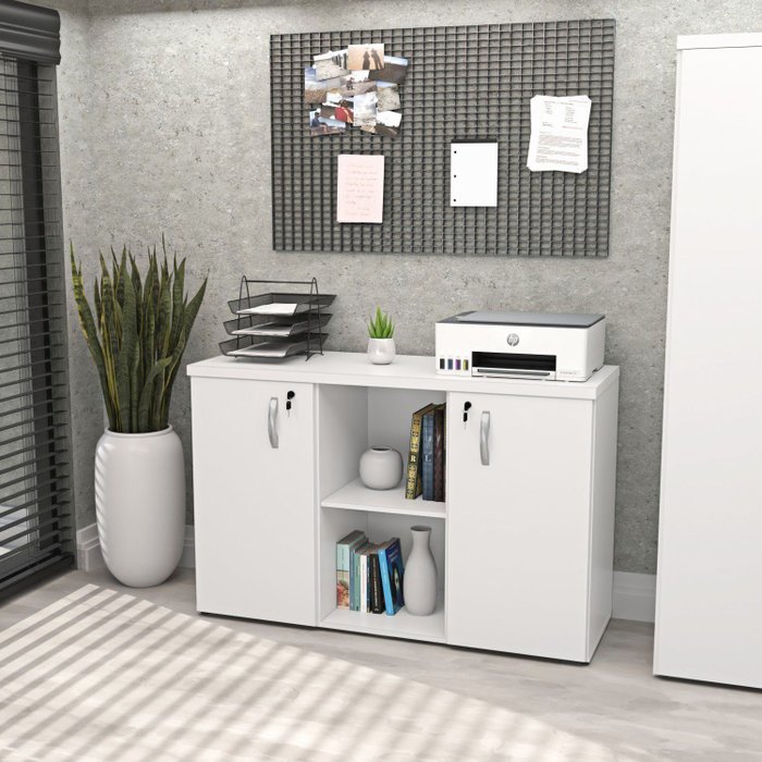 O Armário Baixo Credenza da Linha Office Netmobil é a escolha ideal para manter seus documentos e materiais organizados, acessíveis e seguros. Com um design funcional, conta com duas portas equipadas com fechaduras, garantindo a proteção dos seus pertences. Internamente, suas três prateleiras oferecem espaço versátil para armazenar itens de diversos tamanhos, atendendo às suas necessidades do dia a dia no escritório.
