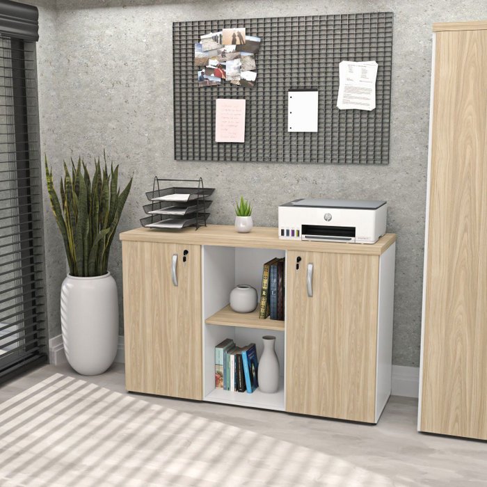 O Armário Baixo Credenza da Linha Office Netmobil é a escolha ideal para manter seus documentos e materiais organizados, acessíveis e seguros. Com um design funcional, conta com duas portas equipadas com fechaduras, garantindo a proteção dos seus pertences. Internamente, suas três prateleiras oferecem espaço versátil para armazenar itens de diversos tamanhos, atendendo às suas necessidades do dia a dia no escritório.