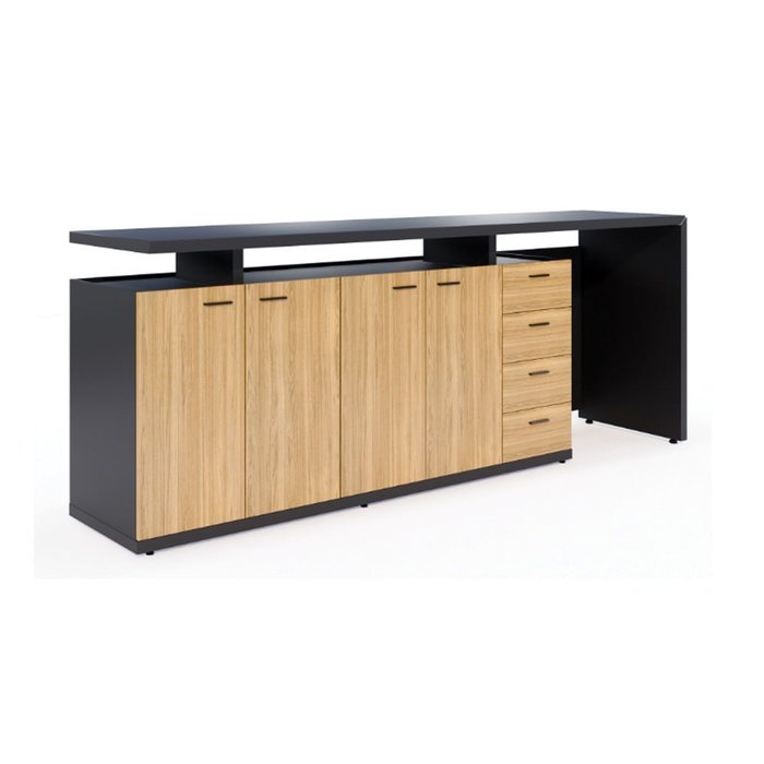 Tampo superior, painel lateral frigobar e base confeccionados em chapa de MDP com 40mm de espessura, sendo uma chapa de 25mm colada em uma chapa de 15mm de espessura, revestido em ambas as faces com filme termo prensado melamínico. O contorno do tampo e base é encabeçado com borda PVC. Portas confeccionadas em aglomerado 15 mm de espessura, revestido em ambas as faces em lâmina de madeira natural com acabamento em selador e verniz. O contorno é encabeçado com borda em lâmina de madeira natural com o mesmo acabamento da face. Portas sustenta-se em oito dobradiças (2 por porta), dotada do sistema Slide-On de amortecimento para que a porta não colida com o móvel e assim não tendo nenhum ruído, com abertura de até 110 graus. Todas as portas são dotadas de puxador retangular, produzido em alumínio maciço com acabamento em pintura. 04 gavetas com laterais costa e fundo em MDP 15 mm de espessura, dotadas corrediças telescópicas de abertura total. Capacidade de peso de 25 kg por gaveta. Frentes de gaveta confeccionadas em aglomerado 15 mm de espessura. Corpo (02 laterais, 02 divisórias verticais, 01 tampo inferior, 01 fundo) as peças confeccionadas em chapa de MDP com 15mm de espessura. As laterais são dotadas de furações para regulagem de prateleiras em toda a altura útil do armário, com 04 pontos de apoio por prateleira. As prateleiras móveis são apoiadas em suportes cilíndricos metálicos. 02 prateleiras móveis confeccionadas em chapa de MDP com 25mm de espessura. Niveladoras de piso produzidos em duas peças em polipropileno injetado, fixados na base através de encaixe, com regulagem para o móvel através de haste metálica, tanto externa e na parte interna do armário, cuja função será contornar eventuais desníveis de piso.