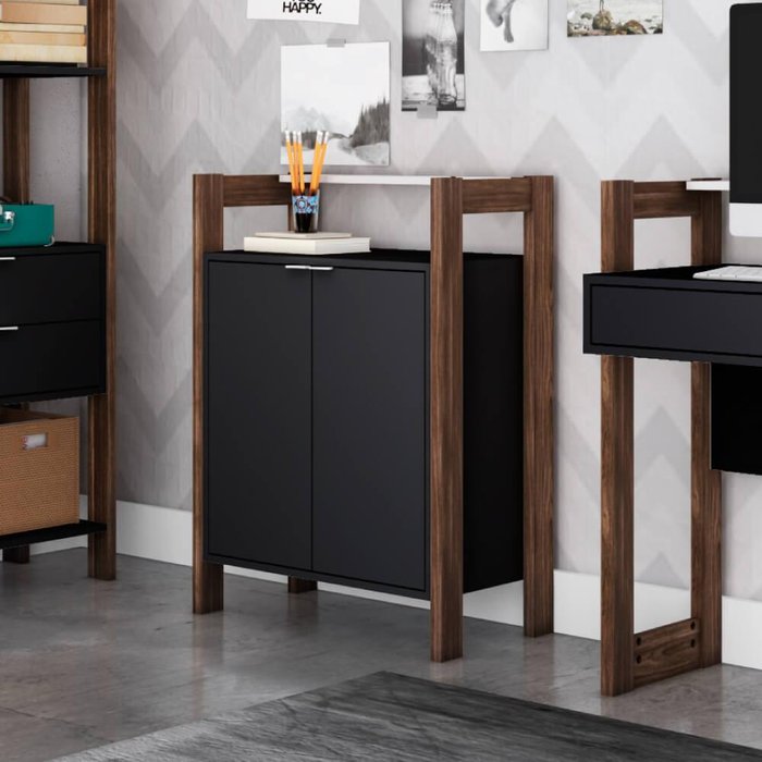Armário Baixo Multiuso 2 Portas e 3 Prateleiras Preto/Nogal