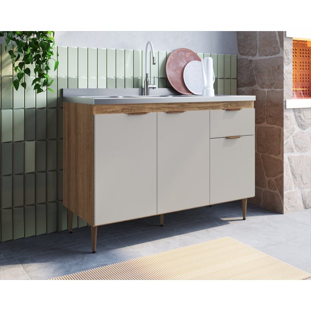 O Balcão 1,20m Veneza possui 3 portas e 2 gavetas, espaço para pia/cuba inox de 1,20m ou tampo que pode ser comprado separadamente.