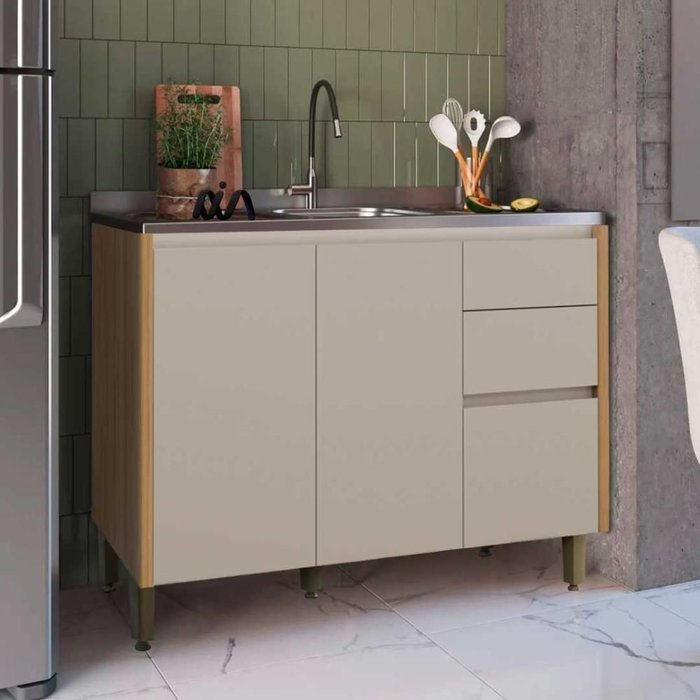 O Balcão de Cozinha para Pia Allure 120 cm combina beleza, praticidade e funcionalidade, sendo perfeito para quem deseja organização e estilo moderno na cozinha.DiferenciaisAcabamento sofisticado: corpo em MDP Vanilla UV Touch e frontais em MDP Cinza Puro BP.Portas de bater com dobradiças metálicas Ø26 mm para fechamento suave e durabilidade.Três gavetas com corrediças telescópicas de abertura total, suportando até 5 kg cada.Prateleira interna suporta até 20 kg, ideal para utensílios e mantimentos.Puxadores em alumínio cinza e pés em poliestireno (PS) champagne com regulagem de altura.Dimensões externas