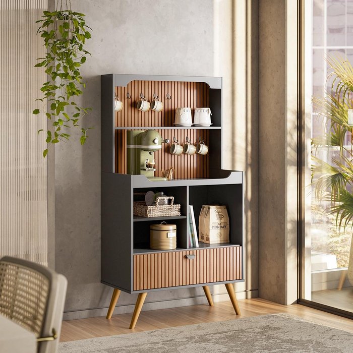 Armário Bancada Cantinho do Café Preto Fosco/Tauari Ripado 1 Porta Basculante com Pés de Madeira - Lukaliam