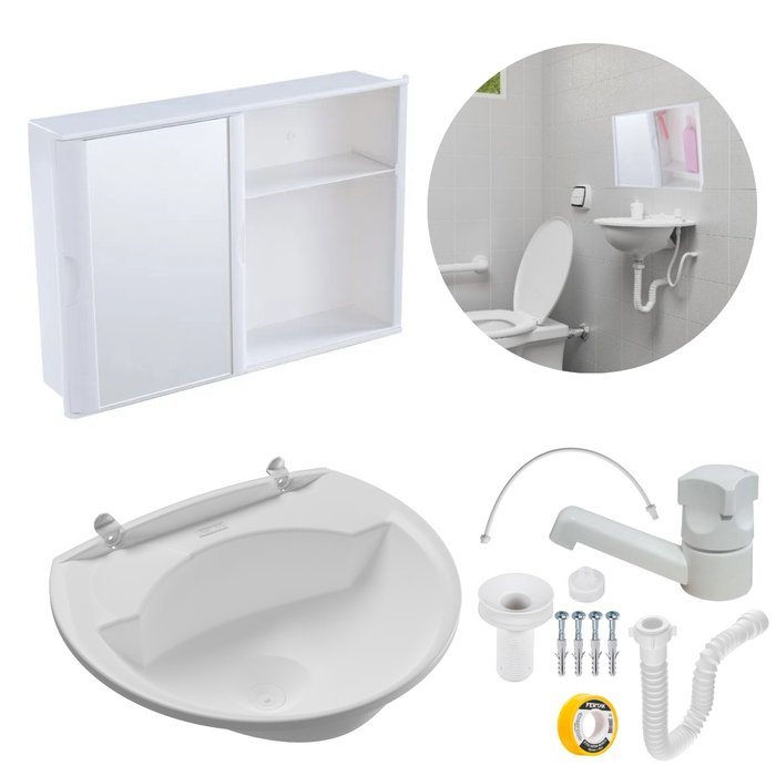 Armário Banheiro Espelheira Sobrepor e Embutir Branco 29x41x10cm + Pia Lavatório Plástico