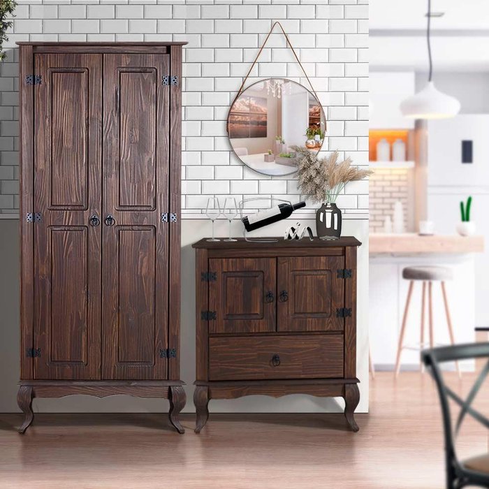 Dimensões da Cristaleira: Largura 80cm; Profundidade 36cm; Altura 175,8cm.Dimensões do Aparador: Largura 80cm; Profundidade 36cm; Altura 84,9cm.Itens Inclusos: 1 cristaleira 1 aparador.- Madeira maciça- Possui pés com design diferenciado estilo Luis XV (também conhecido como pés cabriolet, ou pés de cabra) que dão ao móvel um visual retrô chique- Ambos possuem 02 portas com dobradiças metálicas- Puxadores em metal com design retrô- Cristaleira com 04 divisórias para melhor organização de seus objetos- Aparador com 01 gavetaComplexidade da montagem: Média, pode ser montado por apenas uma pessoa e/ou necessite de maior conhecimento para montagem.Recomendações de uso, manutenção e limpeza: Limpar com flanela ou pano macio seco, não utilizar produtos abrasivos, desengordurantes, álcool ou solvente. Não expor o produto diretamente à luz solar e à umidadeGarantia: 3 mesesOBS: Foto meramente ilustrativa, objetos, utensílios e decoração não fazem parte do produto.
