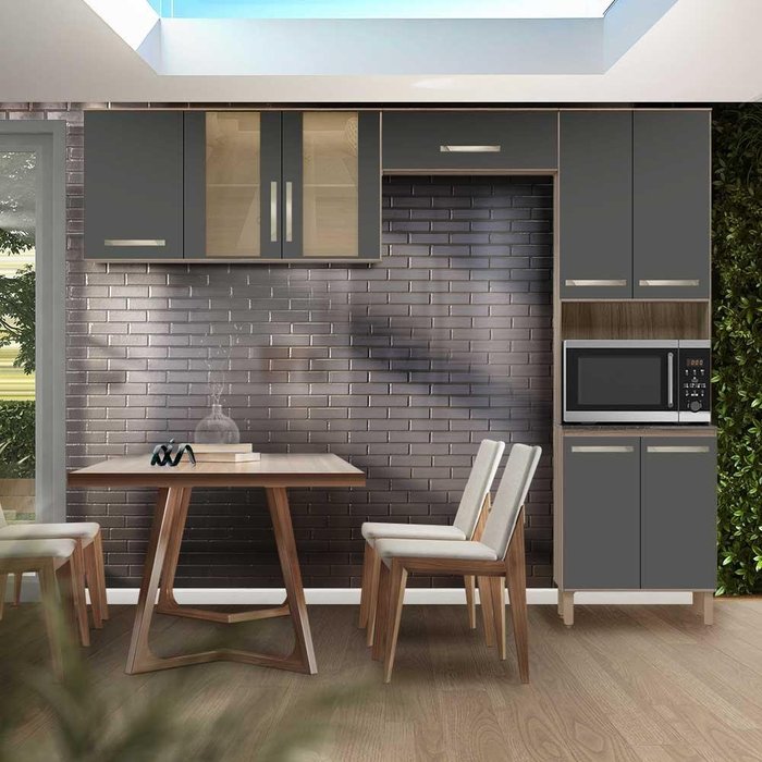 Este armário de cozinha possui uma estrutura robusta feita 100% em MDP. Oferece amplo espaço interno com 8 portas, incluindo 2 com vidro reflecta, que reflete a luz e permite ver o conteúdo. Conta com uma porta basculante de pistão a gás, nicho para forno ou micro-ondas, dobradiças amortecidas e pés ajustáveis em altura para perfeita adaptação ao ambiente.- Estrutura 100% MDP- 8 portas com excelente espaço interno- 2 portas com vidro reflecta, que conta com uma superfície espelhada que reflete o ambiente conforme a incidência de luz. Também possui certa transparência que permite enxergar o que tem dentro do armário- 1 porta basculante com pistão a gás- Nicho para forno ou microondas- Dobradiças com amortecedor- Pés com regulagem de alturaDimensões do produto: Largura superior 261 cm; Largura torre quente 60 cm; Profundidade 43/29 cm; Altura armário aéreo 59 cm; Altura torre quente 208 cm.Itens Inclusos: 1 armário de cozinha.Complexidade da montagem: Média, pode ser montado por mais de uma pessoa e/ou necessite de maior conhecimento para montagem.Recomendações de uso, manutenção e limpeza: Limpar com flanela ou pano macio seco, não utilizar produtos abrasivos, desengordurantes, álcool ou solvente. Não expor o produto diretamente a luz solar e à umidadeGarantia: 3 mesesOBS: Foto meramente ilustrativa, objetos, utensílios e decoração não fazem parte do produto. Manual De Montagem E Instalação