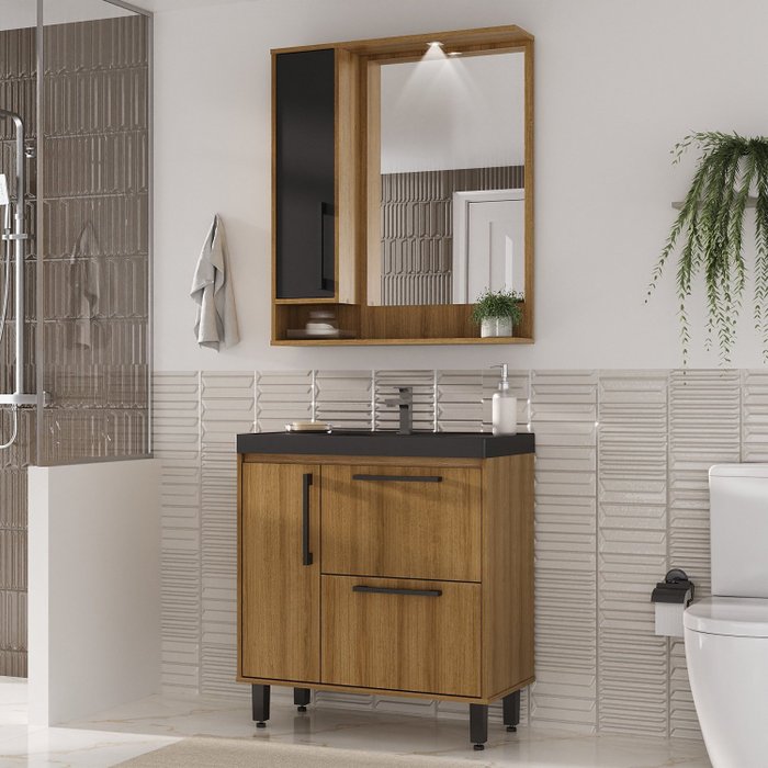 Armário Conjunto de Banheiro com Gabinete, Cuba e Espelheira 2 Portas e 1 gaveta com Led na Espelheira 80 cm Lamina Mel / Preto