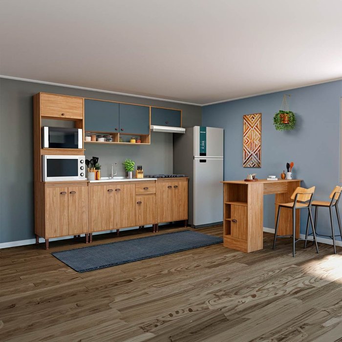 Armário Cozinha 253cm com Bancada Completa 6 Peças Puxador Concha Cor Mel/petróleo Mb9004 Mel e Petróleo