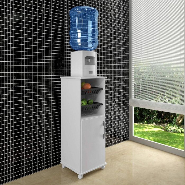 Os pés são em rodízios possibilitando mover para todos os lugares. Possui uma porta e uma prateleira o que faz da organização de objetos, condimentos e utensílios muito mais prática.