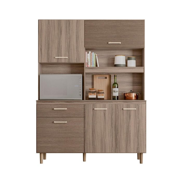 Esse modelo é composto por armários e gavetas que oferecem espaço suficiente para armazenar utensílios de cozinha e eletrodomésticos.