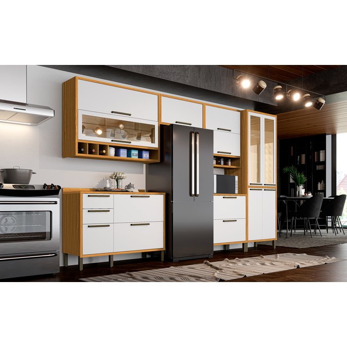 Produto: Cristaleira de Cozinha 4 Portas c/ Vidro ReflectaDimensões(Cm): Profundidade: 47,00 x Largura: 74,50 x Altura: 225,00CARACTERÍSTICAS:- Estrutura do Móvel: MDF- Pintura: UVAcabamento da Pintura: Semi Brilho- Puxador: Alumínio Escovado- Quantidade de Prateleiras: 4- Quantidade de Portas: 4Produto: Balcão de Cozinha 2 Portas e 3 Gavetas c/ TampoDimensões(Cm): Profundidade: 47,00 x Largura: 120,00 x Altura: 90,00CARACTERÍSTICAS:- Estrutura do Móvel: MDF- Pintura: UV- Acabamento da Pintura: Semi Brilho- Gabinete com Tampo- Espessura do Tampo: 25 mm- Puxador: Alumínio Escovado- Quantidade de Prateleiras: 1- Quantidade de Gavetas: 3- Diferenciais da Gaveta: Corrediças Telescópicas- Quantidade de Portas: 2Produto: Armário Aéreo Duplo 120 cm c/ 2 Portas e Vidro Reflecta Dimensões(Cm): Profundidade: 33,50 x Largura: 120,00 x Altura: 90,00CARACTERÍSTICAS:- Estrutura do Móvel: MDF- Pintura: UV- Acabamento da Pintura: Semi Brilho- Pistão a Gás- Puxador: Alumínio Escovado- Quantidade de Prateleiras: 2- Quantidade de Portas: 2- Quantidade de nichos: 4- Diferenciais dos Nichos: Nicho GarrafeiroProduto: Armário Aéreo Geladeira c/ 1 Porta BasculanteDimensões(Cm): Profundidade: 33,50 x Largura: 80,00 x Altura: 40,00CARACTERÍSTICAS:- Estrutura do Móvel: MDF- Pintura: UV- Acabamento da Pintura: Semi Brilho- Pistão a Gás- Puxador: Alumínio Escovado- Quantidade de Portas: 1- Quantidade de nichos: 2