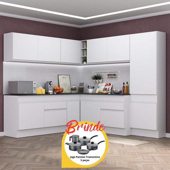 Armário Cozinha Completa Canto Veneza Mp2102 Multimóveis Branco + Brinde Jogo de Panelas Tramontina Branco