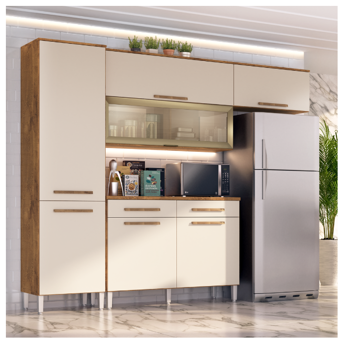 Armário Cozinha Girassol 7 Portas 2gav Pés Reguláveis Castanho/off White