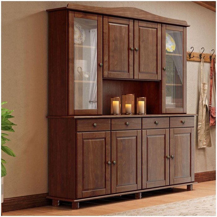 Armário Cristaleira Para Cozinha Linha Rubi Café 8 Portas E Vidro Liso Incolor 4 Gavetas Madeira Maciça Pinus - Finestra