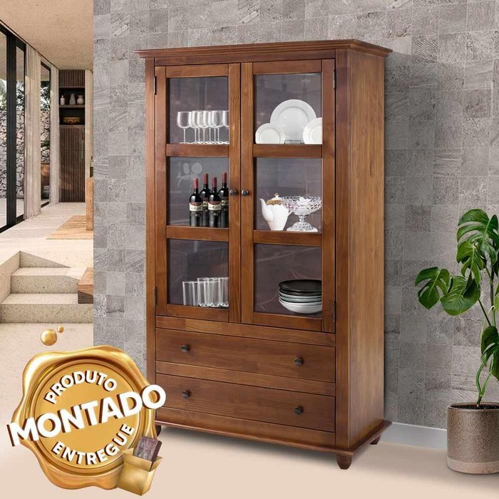 Dimensões do produto: Largura 100 cm; Profundidade 45 cm; Altura 170 cm.Itens Inclusos: 1 cristaleira- 100% madeira maciça Pinus- 2 portas com vidro- 2 prateleiras internas- 2 gavetas com corrediças telescópicas- Puxadores em metal- Acabamento em verniz fosco- Prateleiras suportam até 15 kg- Gavetas suportam até 10 kg Complexidade da montagem: Média, pode ser montado por mais de uma pessoa e/ou necessite de maior conhecimento para montagem.Recomendações de uso, manutenção e limpeza: Limpar com flanela ou pano macio seco, não utilizar produtos abrasivos, desengordurantes, álcool ou solvente. Não expor o produto diretamente a luz solar e à umidadeGarantia: 3 mesesOBS: Foto meramente ilustrativa, objetos, utensílios e decoração não fazem parte do produto.