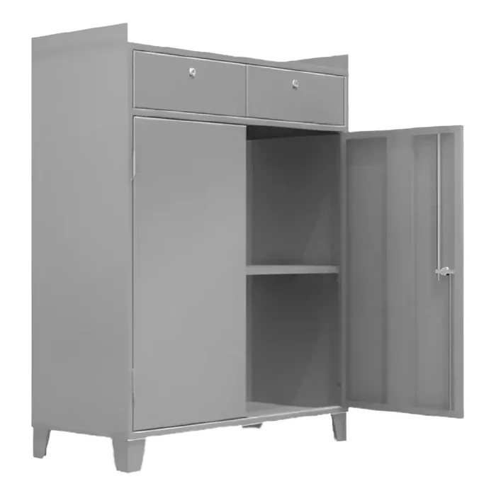 Armário de aço ferramenteiro duplo, este armário em aço armazena ferramentas de maneira versátil e segura, contando com fechadura frontal. Prático e extremamente resistente, possui 2 portas com 1 prateleira interna com capacidade de 50kg e duas gaveta com puxador. Produzido em Aço de alta qualidade em chapa 26, com tratamento anti-ferruginoso. O acabamento em sistema de pintura eletrostática a alta temperatura a pó (epóxi) também garante maior durabilidade da cor e resistência à ferrugem.