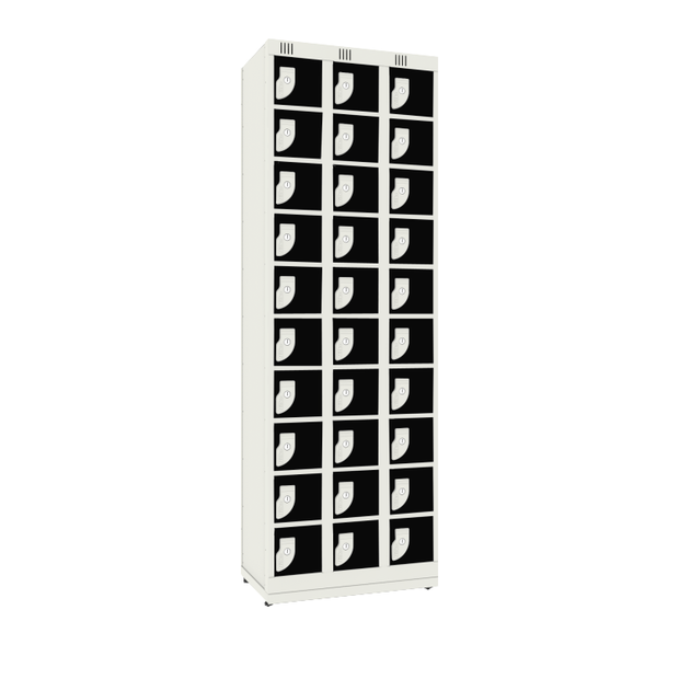 Guarda volumes de aço com 30 portas, ideal para guardar pequenos objetos como celulares, carteiras e itens de higiene pessoal. Muito usado em academias, indústrias, escolas e bancos.