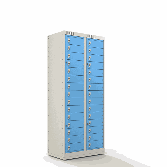 Armário de aço Profissional Distribuidor em aço com trinta portas individuais e duas portas mestra – com carregamento único e retirada individual;
