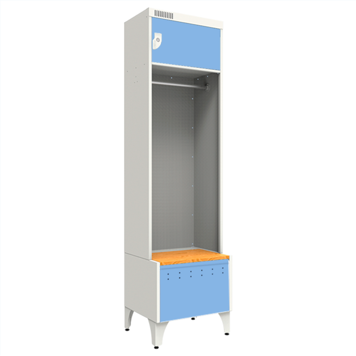 Armário de aço para vestiários de estádio de futebol, com compartimento superior, inferior e um cabideiro;