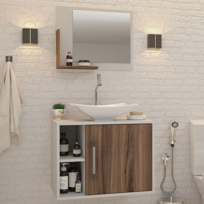 Armário de Banheiro com Cuba e Espelho 1 Porta 2 Prateleiras Branco Chess/Nogal 13689 - Compace