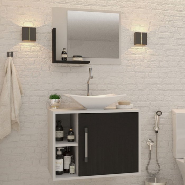 Armário de Banheiro com Cuba e Espelho 1 Porta 2 Prateleiras Branco Chess/Preto ônix 13689 - Compace