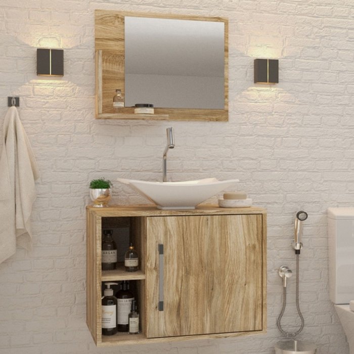 Armário de Banheiro com Cuba e Espelho 1 Porta 2 Prateleiras Carvalho 13689 - Compace