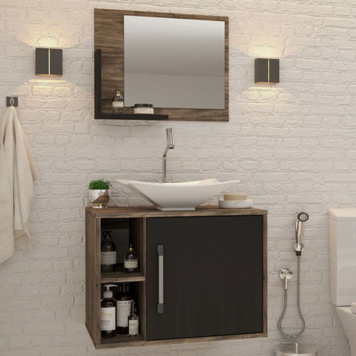 Armário de Banheiro com Cuba e Espelho 1 Porta 2 Prateleiras Carvalho Dark/Preto ônix 13689 - Compac