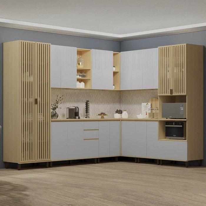 Esse modelo é composto por armários e gavetas que oferecem espaço suficiente para armazenar utensílios de cozinha e eletrodomésticos.
