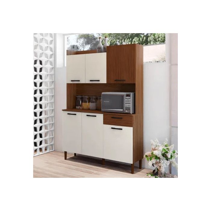 Armário de Cozinha 121cm Pádua Nogueira/off White/ripado/gris Freijó/Gris