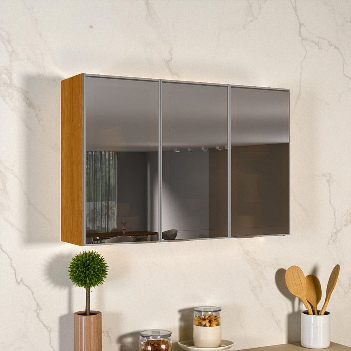 Armário de Cozinha 3 Portas 120cm Vidro Reflecta 100% MDF Dobradiças Slow Motion Lúmina Itatiaia Cinamomo/Fendi